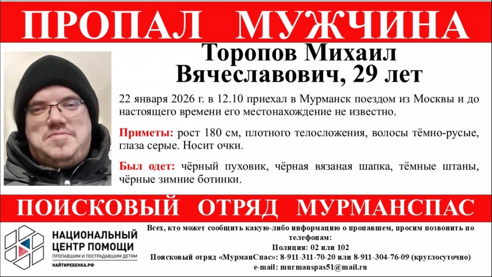 В Мурманске ищут 29-летнего Михаила Торопова. 22 января в 12.10 он приехал в столицу Заполярья поездом из Москвы.