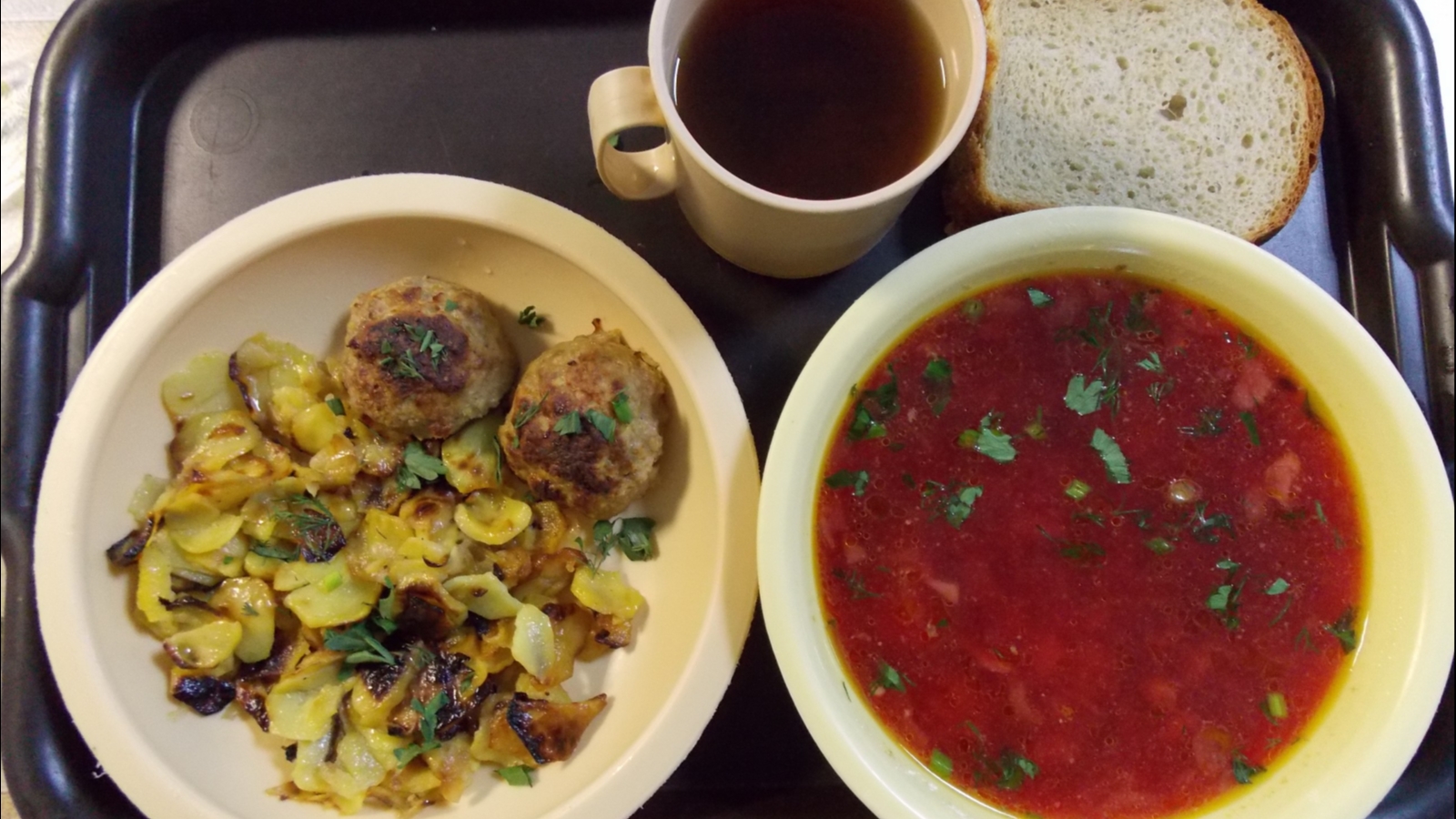 «Предусмотрено приготовление в столовых учреждений котлет, порционных блюд из мяса, жареного картофеля, гарниров из крупы гречневой, риса, а также приготовление овощей к основному гарниру второго блюда (холодная закуска), таких как соленые огурцы с луком и растительным маслом, солёные помидоры с луком и растительным маслом, икра свекольная. Вместо хлеба пшеничного подаётся булочка», - отметили в ведомстве.