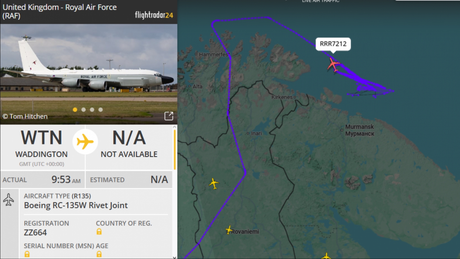 Британский Boeing с позывным RRR7212 кружит восточнее полуострова Рыбачьего. Это самолёт радиоэлектронной разведки королевских ВВС.