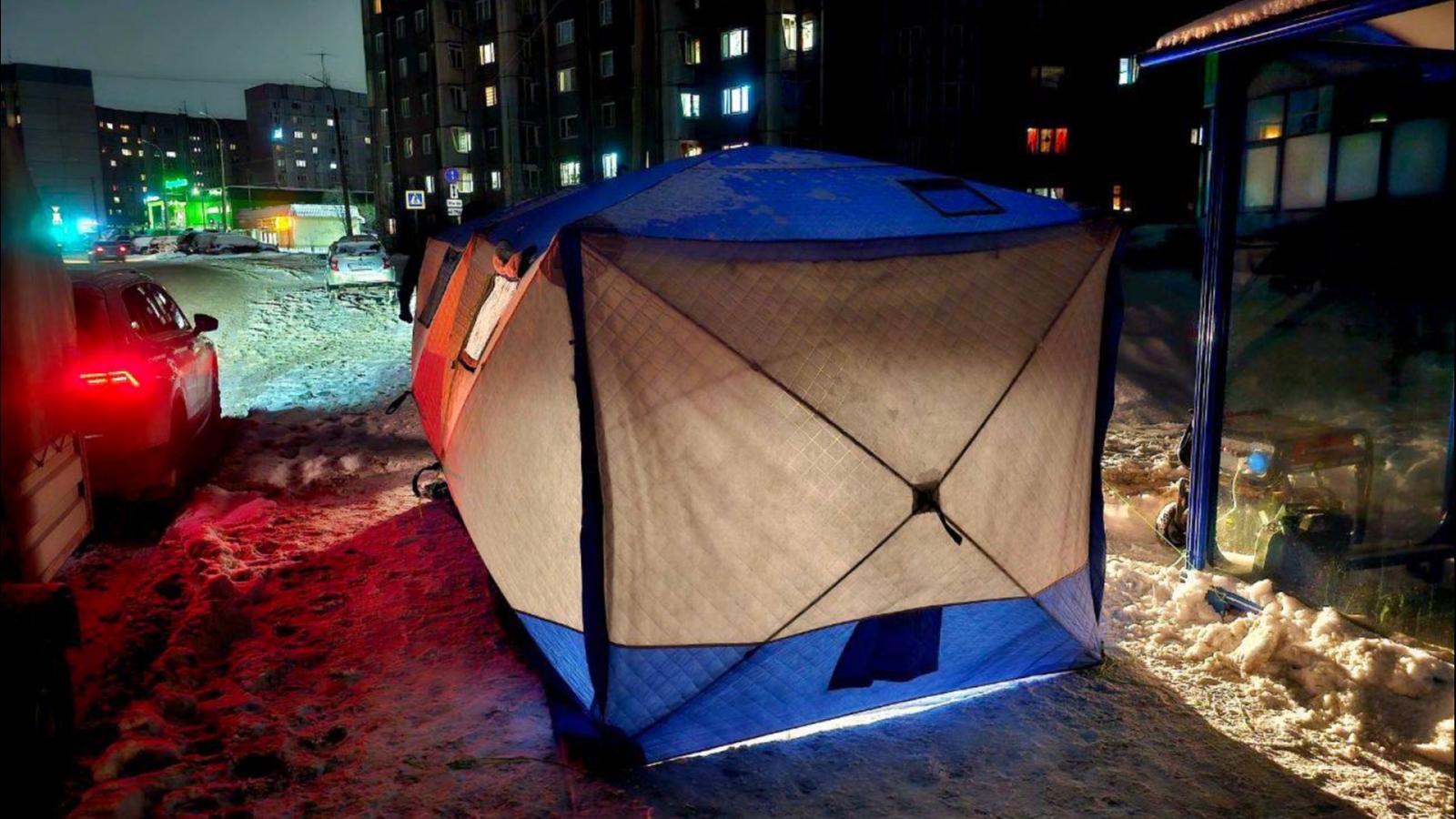 В районе остановки на улице Мира, 14 в Мурманске, возле магазина «Пятерочка», открыт уличный пункт, где можно подзарядить телефон и получить сухой паек.