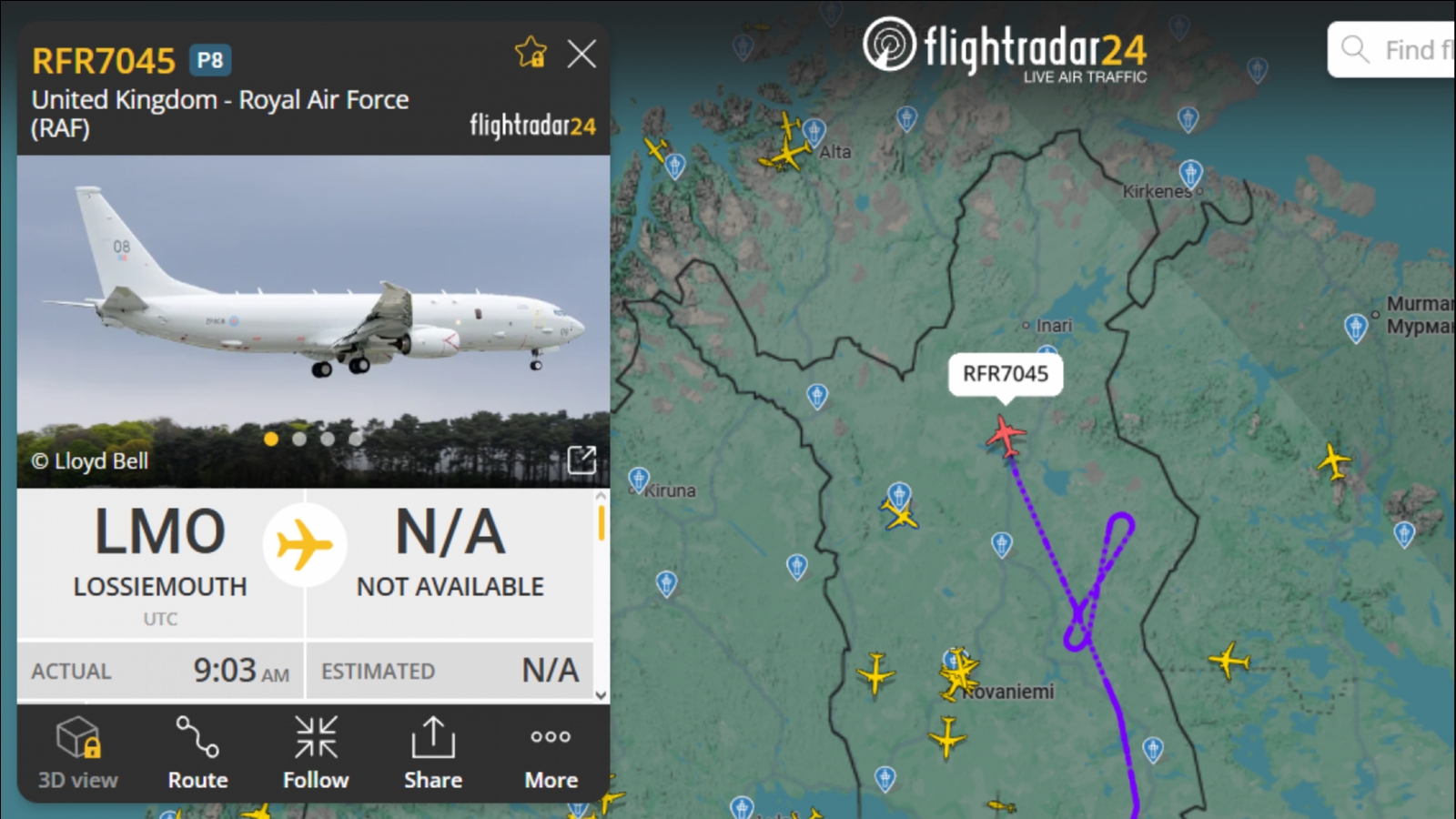 Днём 11 февраля у границы Мурманской области работал противолодочный самолёт Boeing Poseidon MRA1 британских ВВС с позывным RFR7045.