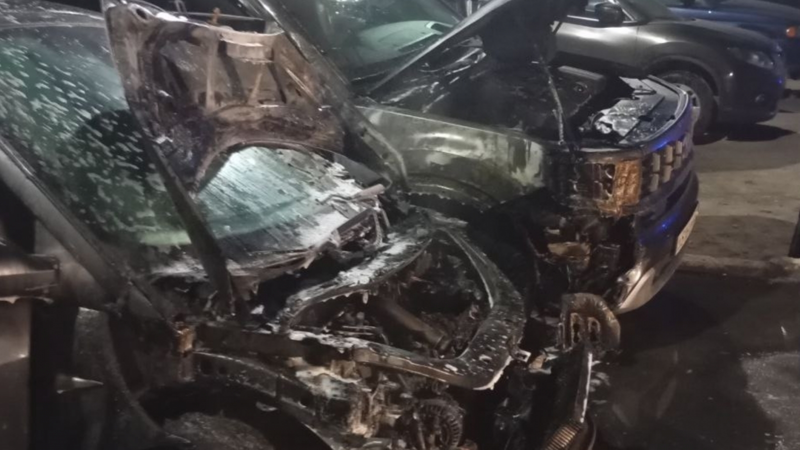 В 06.22 возгорание ликвидировано. В результате пожара в автомобиле Renault Scenic сгорел моторный отсек. В автомобиле Kia Mohave частично обгорели крыло, бампер и фары.