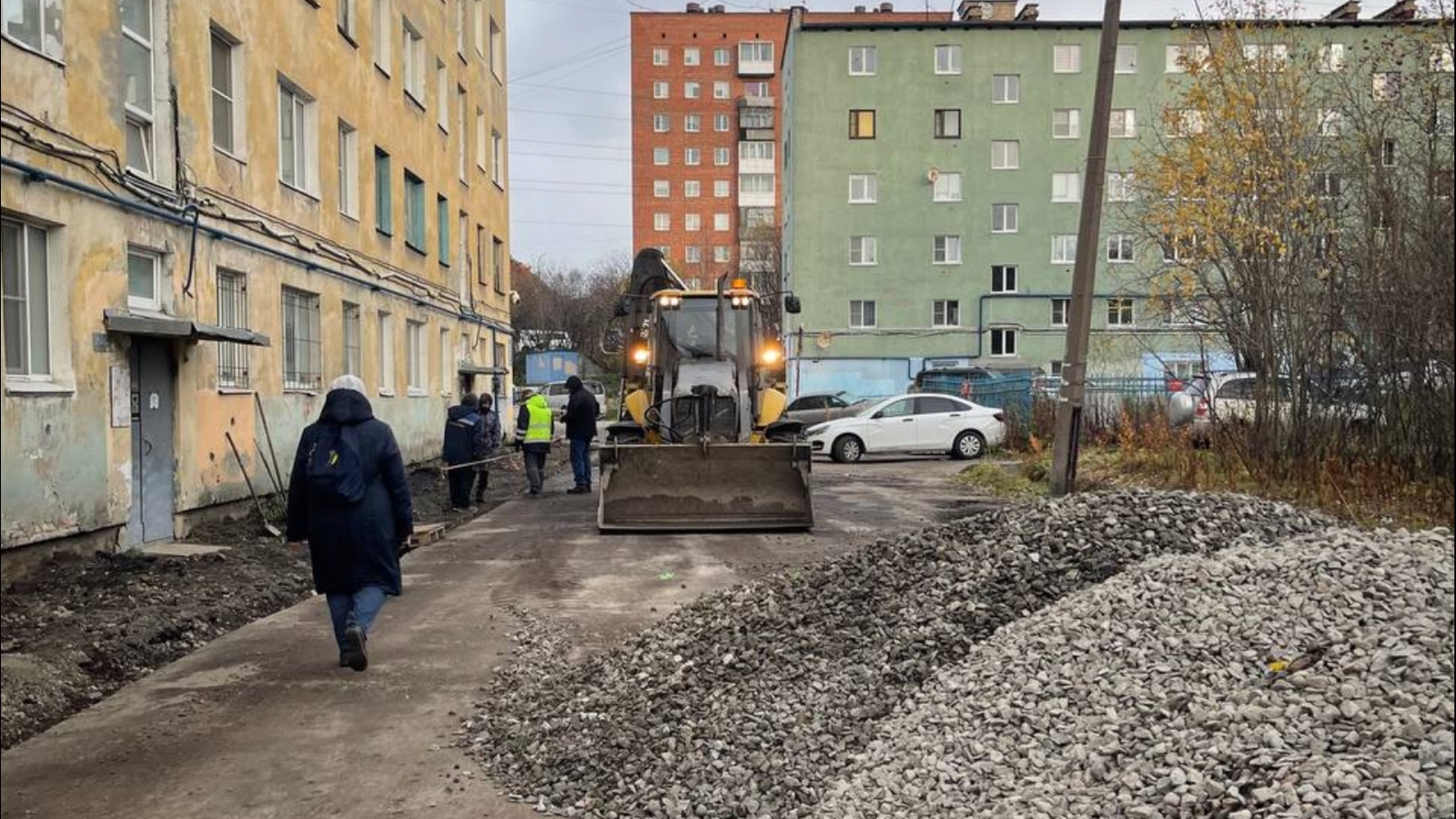Рабочие уже сняли верхний слой асфальта и привезли щебень.