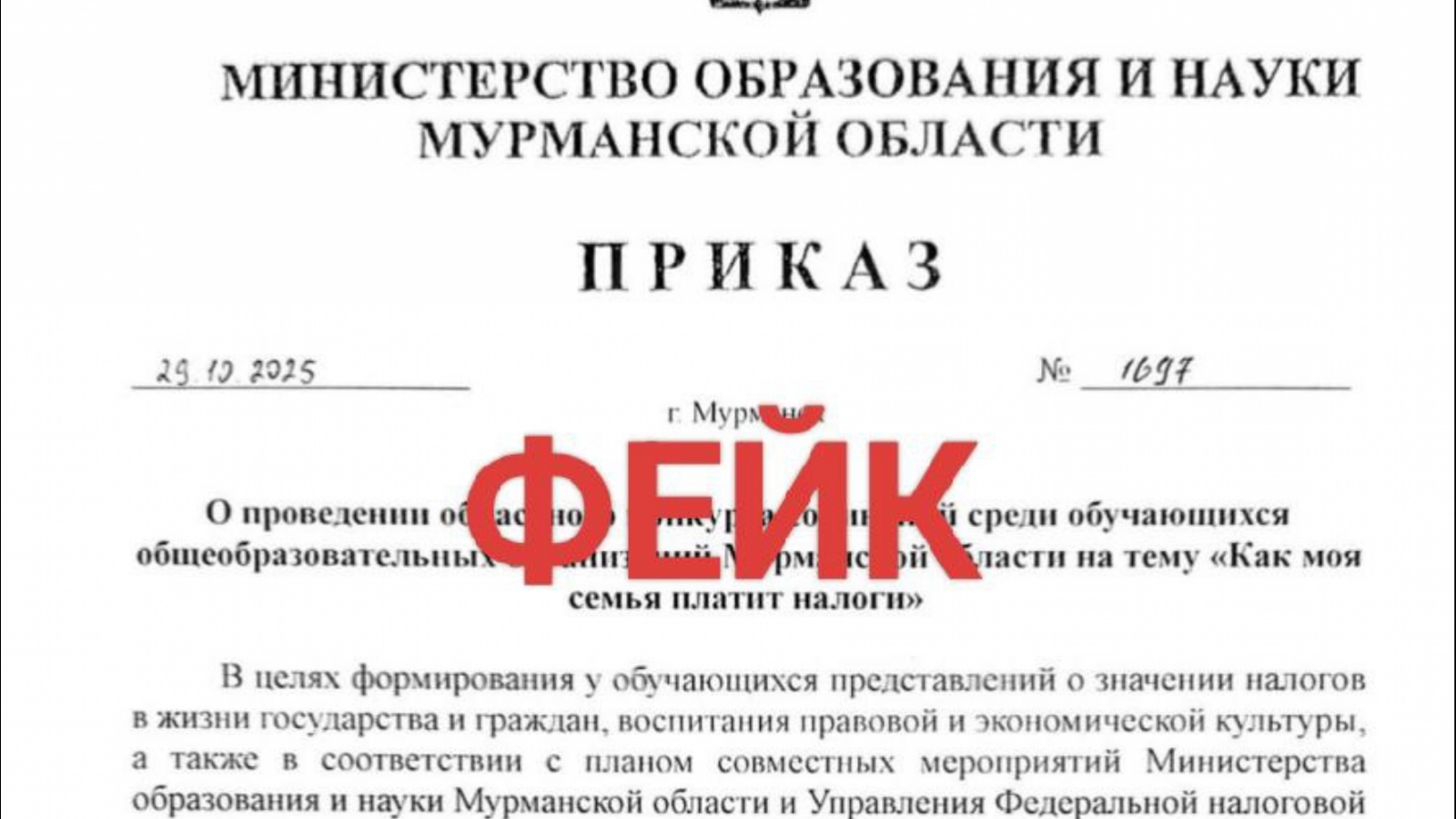 В Мурманской области распространяют фейковый приказ Минобразования и науки Мурманской области о конкурсе сочинений для школьников.