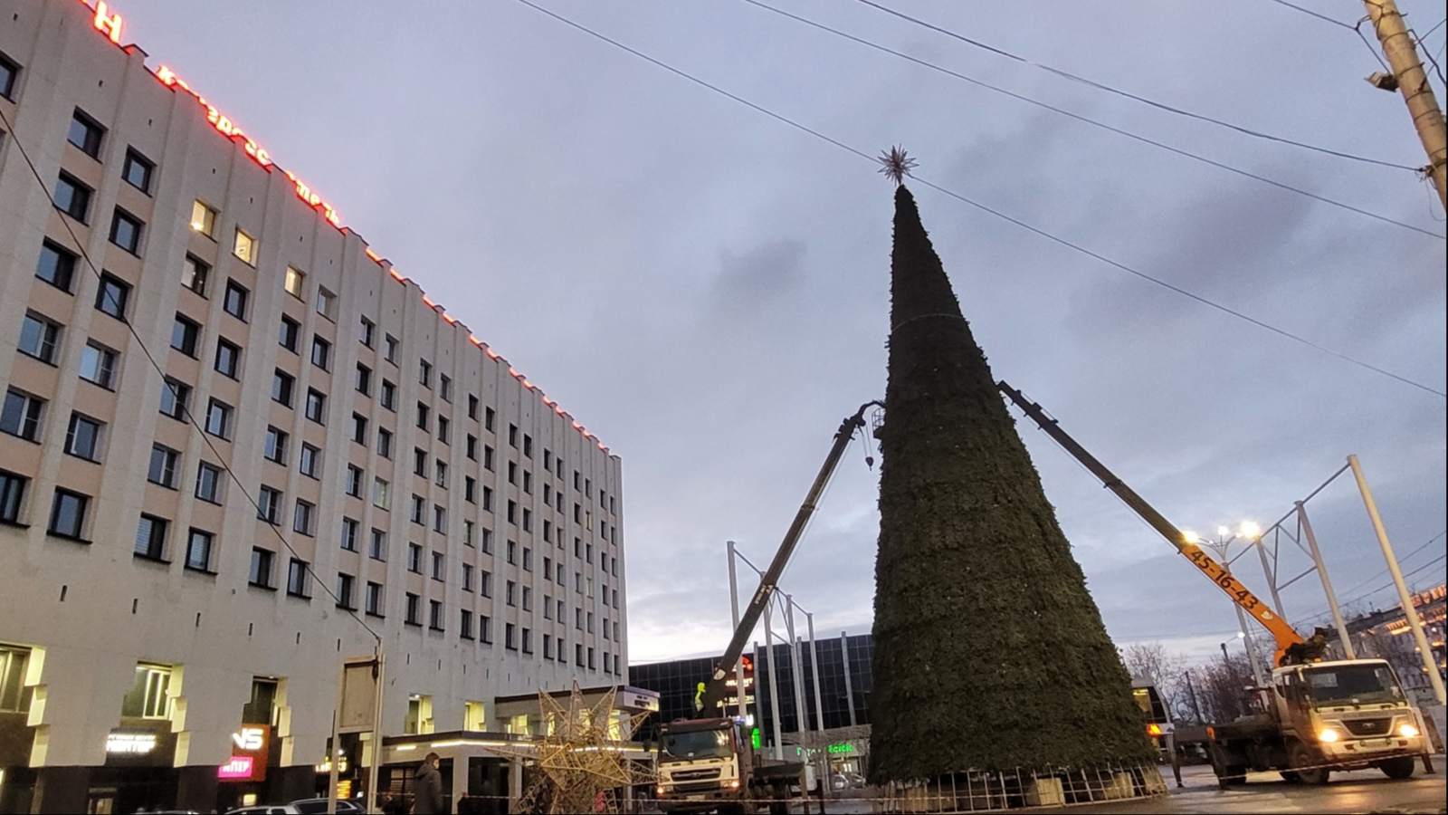 В столице Заполярья рабочие заканчивают установку главной ёлки на улице Воровского, перед гостинично-деловым центром «Меридиан».