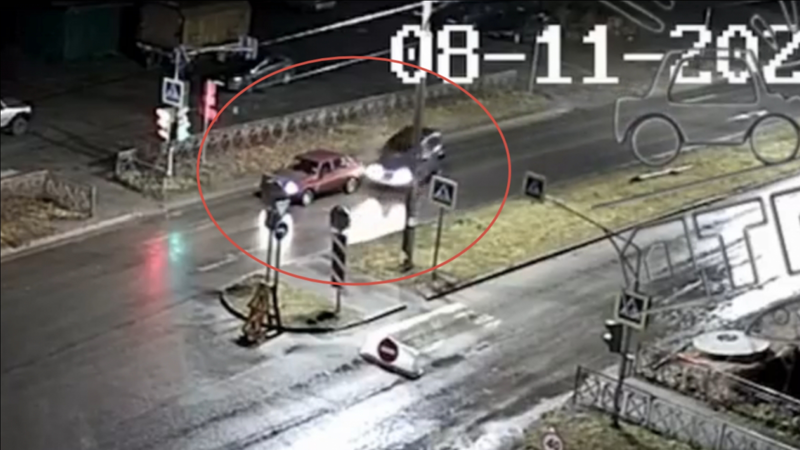 В Апатитах ночью субботы произошла авария на пустой дороге. Момент происшествия зафиксировала камера, установленная в городе.