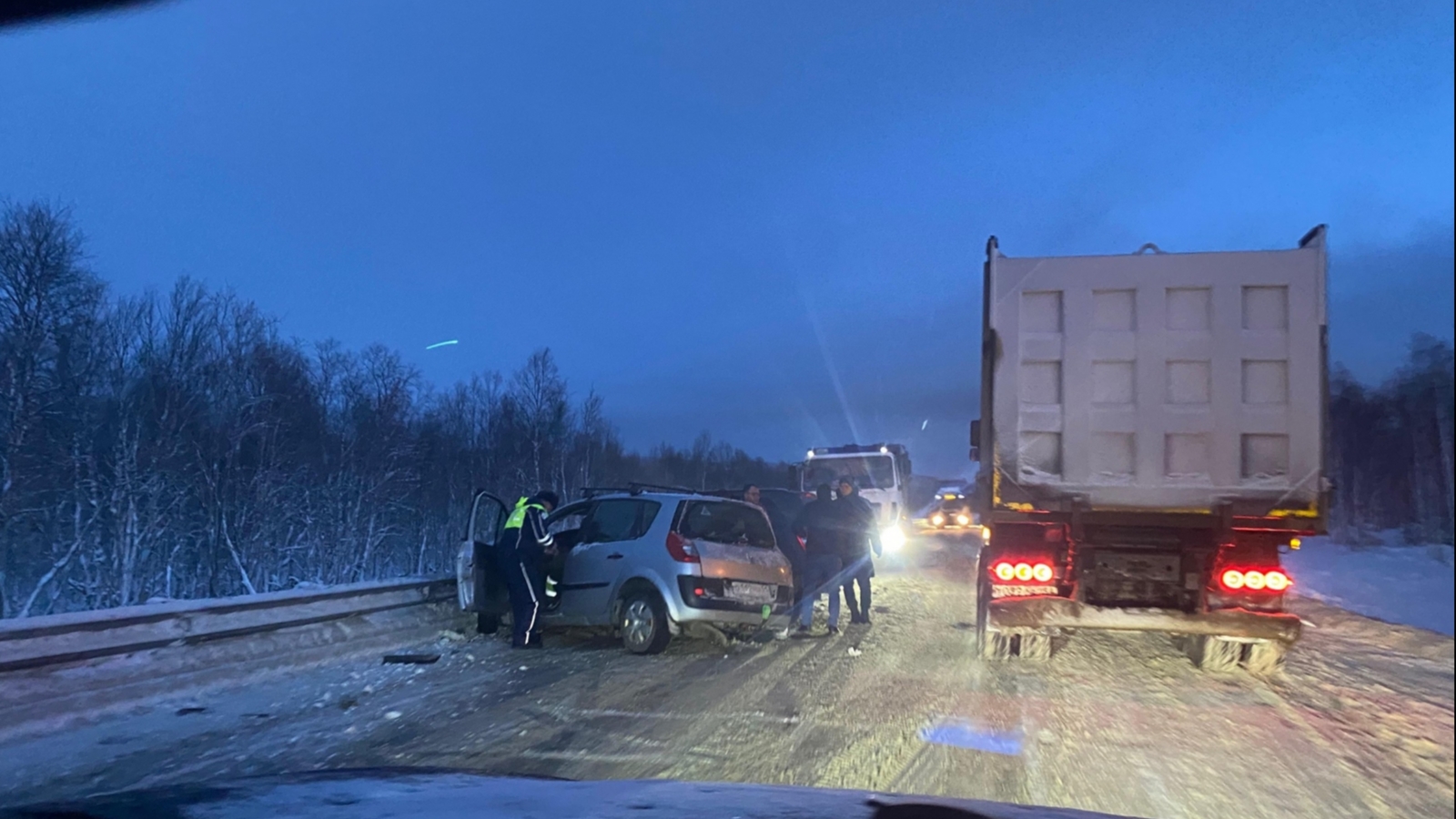 После отворотки на Полярный в сторону Ура-Губы произошла авария с участием двух автомобилей. Там столкнулись две легковушки.