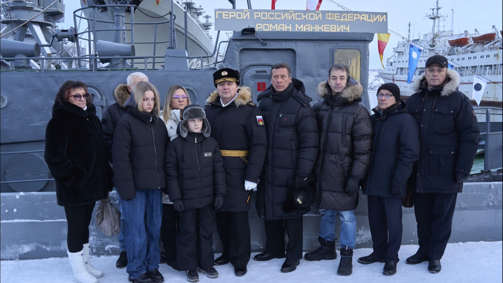 Супруге Романа Юрьевича – Евгении Николаевне – вручили памятную фотографию катера, флаг Военно-Морского Флота, приказ Главнокомандующего ВМФ о присвоении почётного наименования.