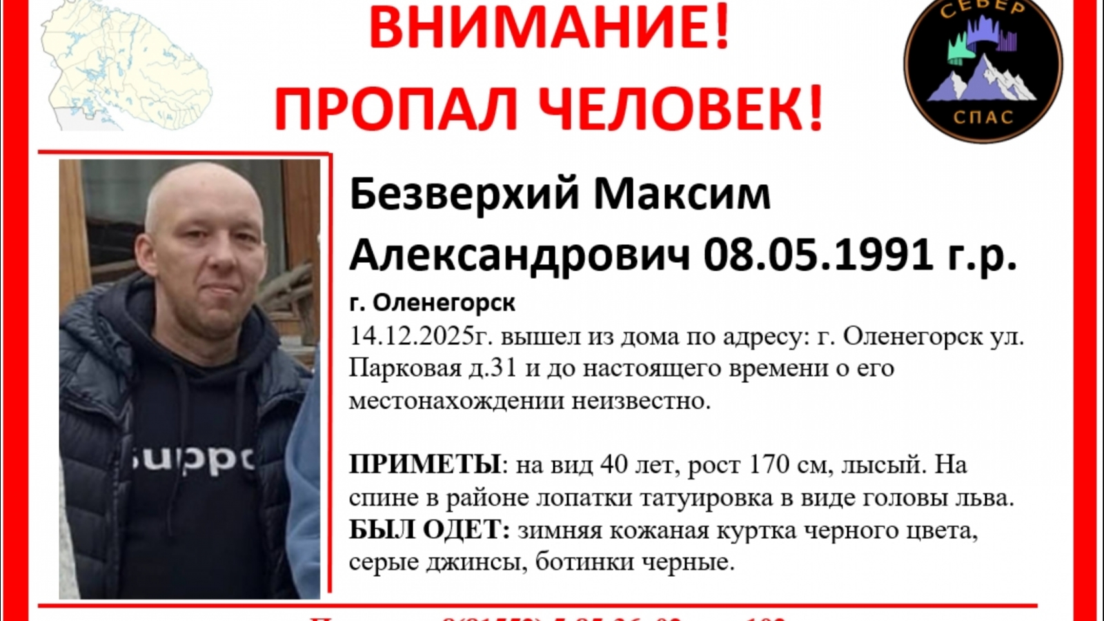 Всех, кто что-либо знает о пропавшем, просят обращаться в поисковый отряд «СеверСпас» по телефону: 8(953) 757-57-48 или в полицию.