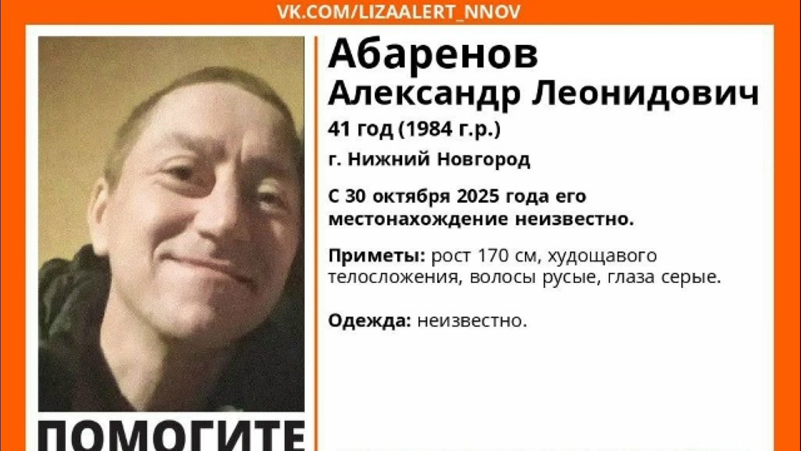 В Мурманской области ищут 41-летнего Александра Абаренова. Он не выходит на связь с 30 октября 2025 года.