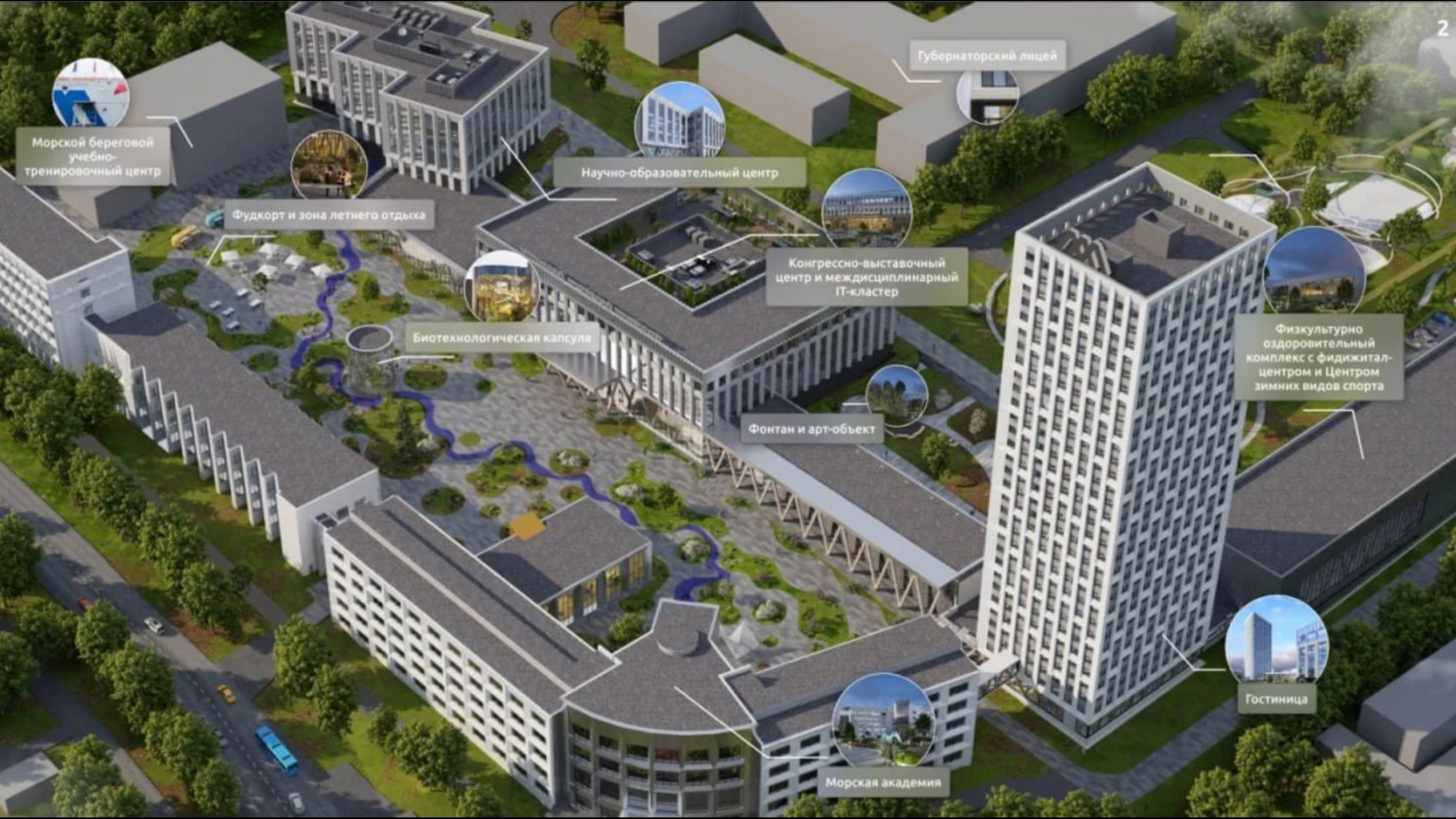 На рендере нет зданий КСК, столовой и корпусов Э, Д, П, Е, С и М. На их месте, видимо, будут построены научно-образовательный и конгрессно-выставочный центры и междисциплинарный IT-кластер.