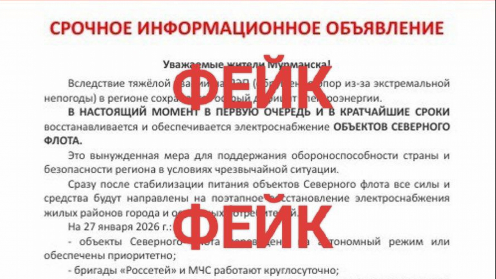 Мурманский оперативный штаб предупредил о вбросе фейковой панической информации.