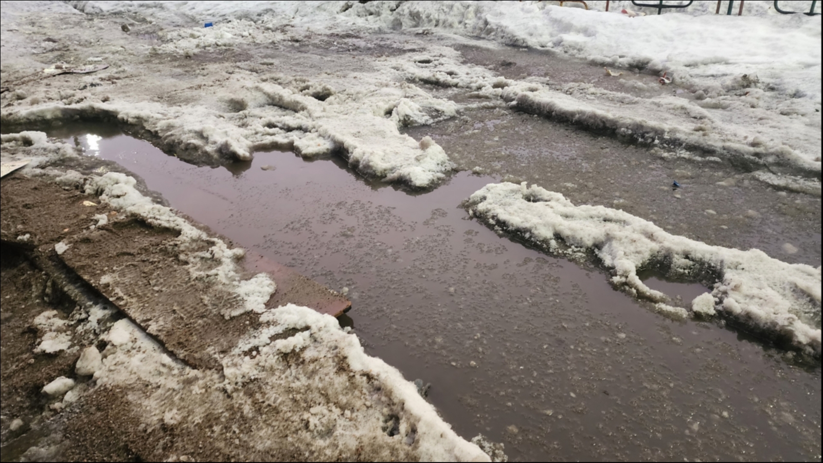 Жители смеются, что нужно было весну передвинуть «на попозже», тогда, может быть, и в горкомхозе заметили, что во время таяния снега вода с горы течёт прямо во двор. И весной в подъезд можно зайти только по мосткам. Кроме того, вода течёт в подвал дома, Образуя питательную среду для комаров, плесени и вони.
