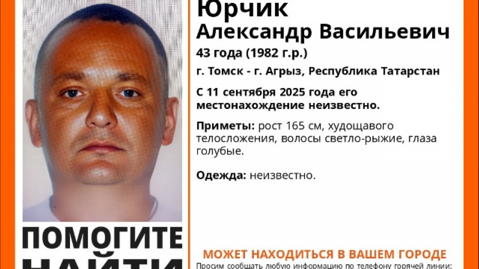 На Кольском полуострове ведут поиск 43-летнего Александра Юрчика. С 11 сентября 2025 года местонахождение уроженца Республики Татарстан неизвестно.