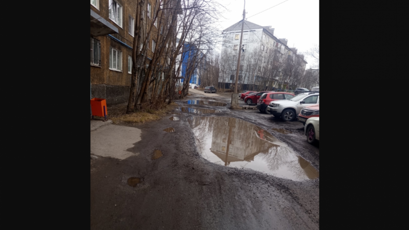 В Оленьей Губе жалуются на опасный участок дороги, где асфальт растаял вместе со снегом.