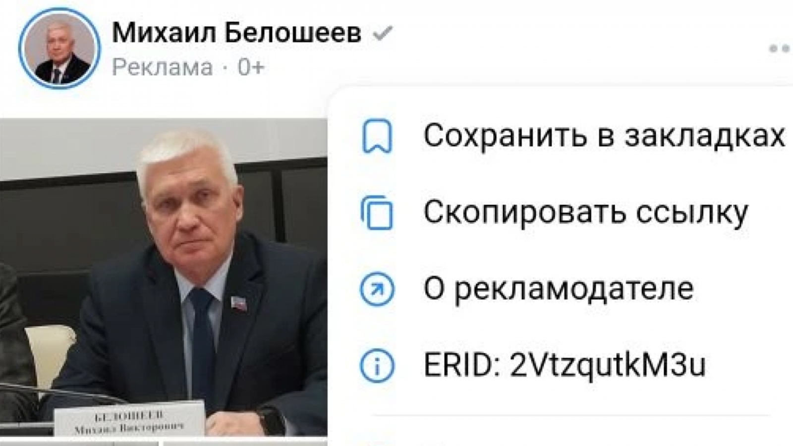 В ленте северян время от времени появляются материалы Михаила Белошеева с его личной страницы с пометкой «Реклама. 0+». Приводится также и идентификационный номер оплаченного рекламного материала.